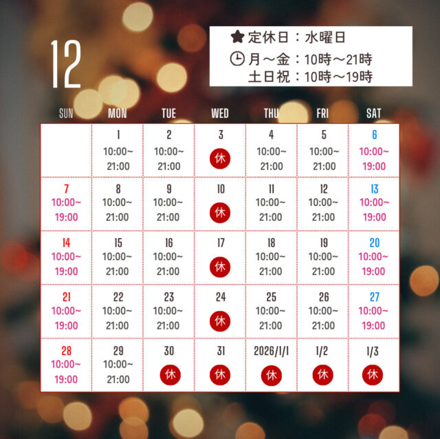 年末年始は2025/12/30(火)〜2026/1/3(土)まで休業日とさせていただきます。